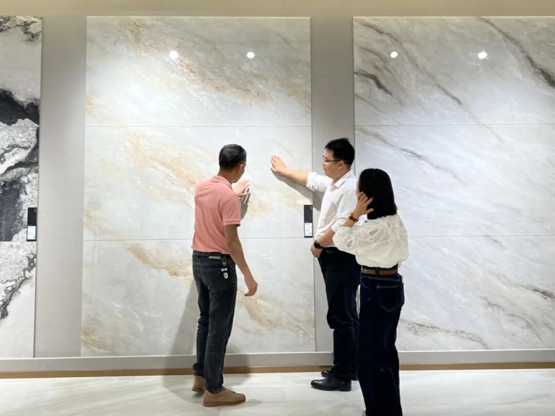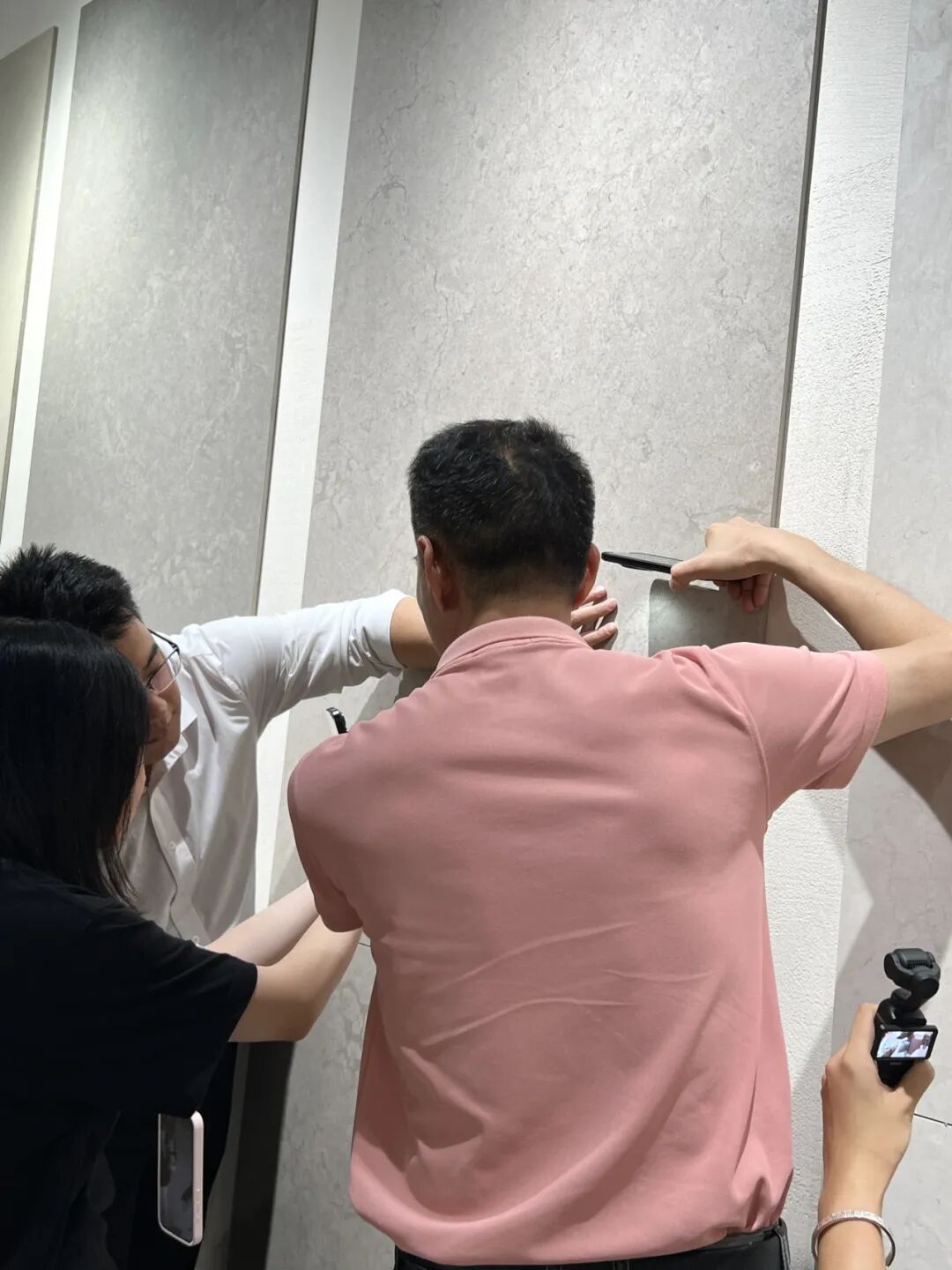 天纬厂厂长-何绍春介绍到,深度挖掘产品本身的天然特性。以匠心打磨还原石材本真,复刻自然肌理的原生质感,从纹理层次的深浅过渡、色彩饱和度的精准把控,到砖面触感的细腻度与舒适度,每一个环节都反复推敲、精细调试。在视觉呈现上,兼顾层次与格调,更融入丰富细腻的触感与灵动光影质感,让每一片瓷砖都兼具美学与质感,真正做到看得见的高级,摸得到的品质。