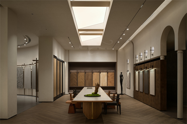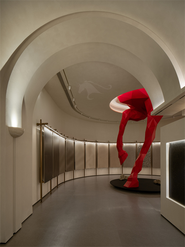 在空间布局上,入口长廊以连续拱券结构营造层层递进的空间韵律,加厚墙体巧妙打造一体式艺术画框,将玛缇瓷砖产品嵌入其中,借助专业定点射灯聚焦肌理质感,如同美术馆珍藏艺术品般逐一呈现,让到访者近距离触摸、品鉴瓷砖的纹理层次与色彩温度。全场统一标准化展框设计,规整视觉秩序,弱化商业推销感,强化 “瓷砖即艺术藏品” 的品牌调性。