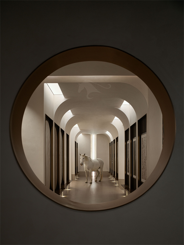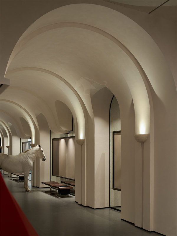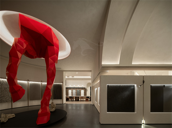 空间软装与艺术装置更是点睛之笔,纯白骏马艺术雕塑静立空间一隅,诠释纯粹、高级、诗意的品牌气质;核心区域红色奔腾马蹄装置动感十足,一静一动相互呼应,刚柔并济之间,诠释玛缇昂扬向上、坚守原创的品牌内核。